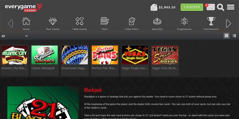 If you’re into tournament action, Everygame has you covered, too. There are tons of blackjack tournaments available weekly, with low buy-ins and huge jackpots to be won.